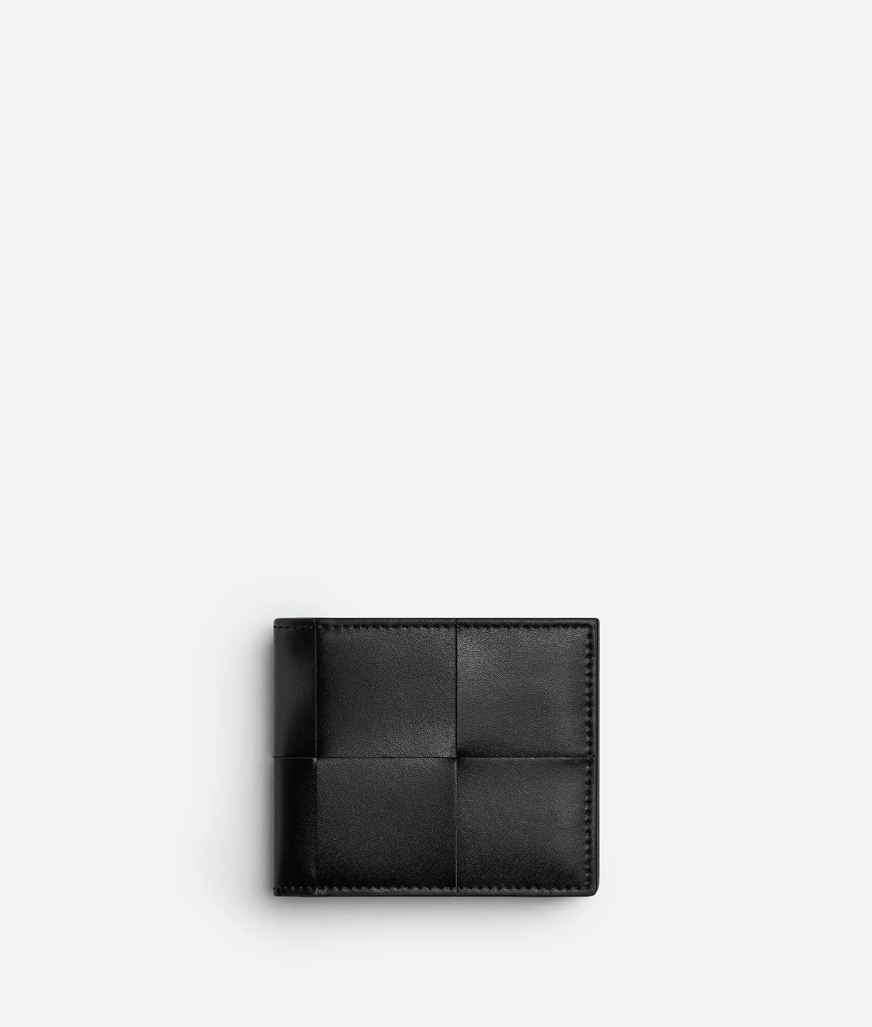 Intreccio calfskin leather wallet with contrasted interior. Product Details - Three card slots, one bill compartment, two additional pockets, one coin purse - Material: calfskin - Lining: Calfskin - Color: Black/Parakeet - Hardware: Silver finish - Height: 8.5 cm | 3.3" - Width: 10 cm | 3.9" - Depth: 1 cm | 0.4” - Made in: Italy - Product code: 749455VBWD51042