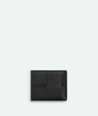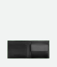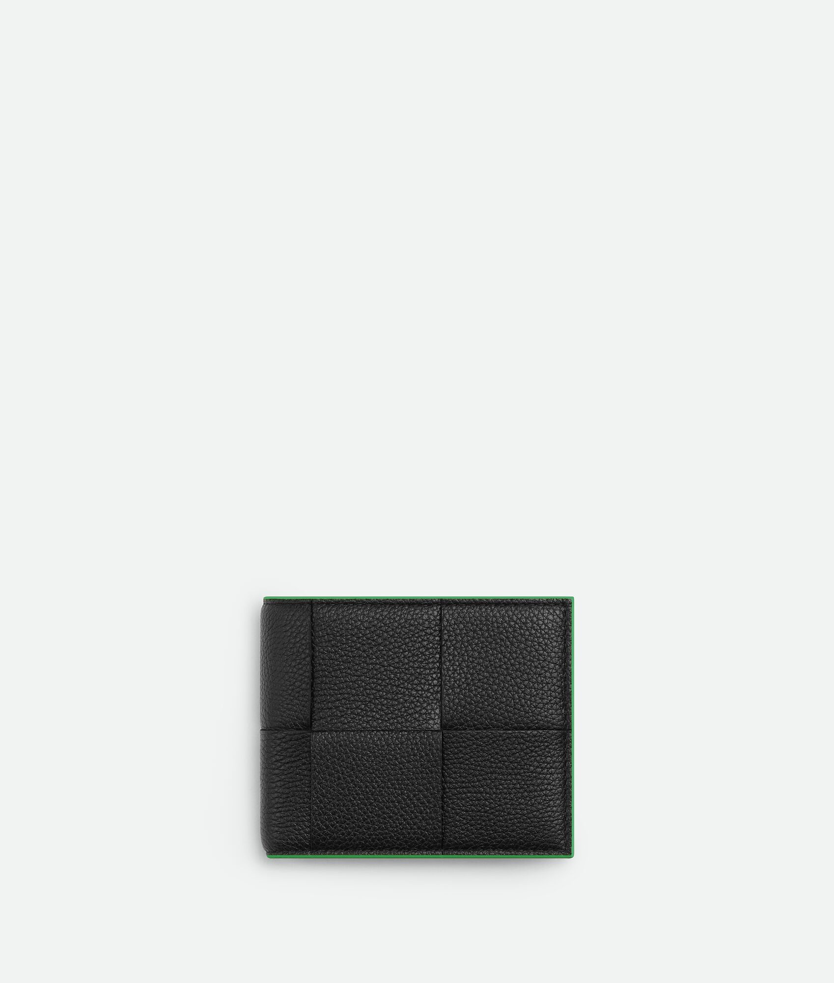 Intreccio grained leather wallet. Make it unique with a handmade customization Product Details - Intreccio grained leather wallet - Three card slots, one note compartment, two additional pockets, one coin purse - Material: Calfskin - Lining: Calf leather - Color: Black/Parakeet - Hardware: Silver finish - Height: 8.5 cm I 3.3" - Width: 10 cm I 3.9" - Depth: 1 cm I 0.4" - Made in: Italy - Product code: 749455VCP141045