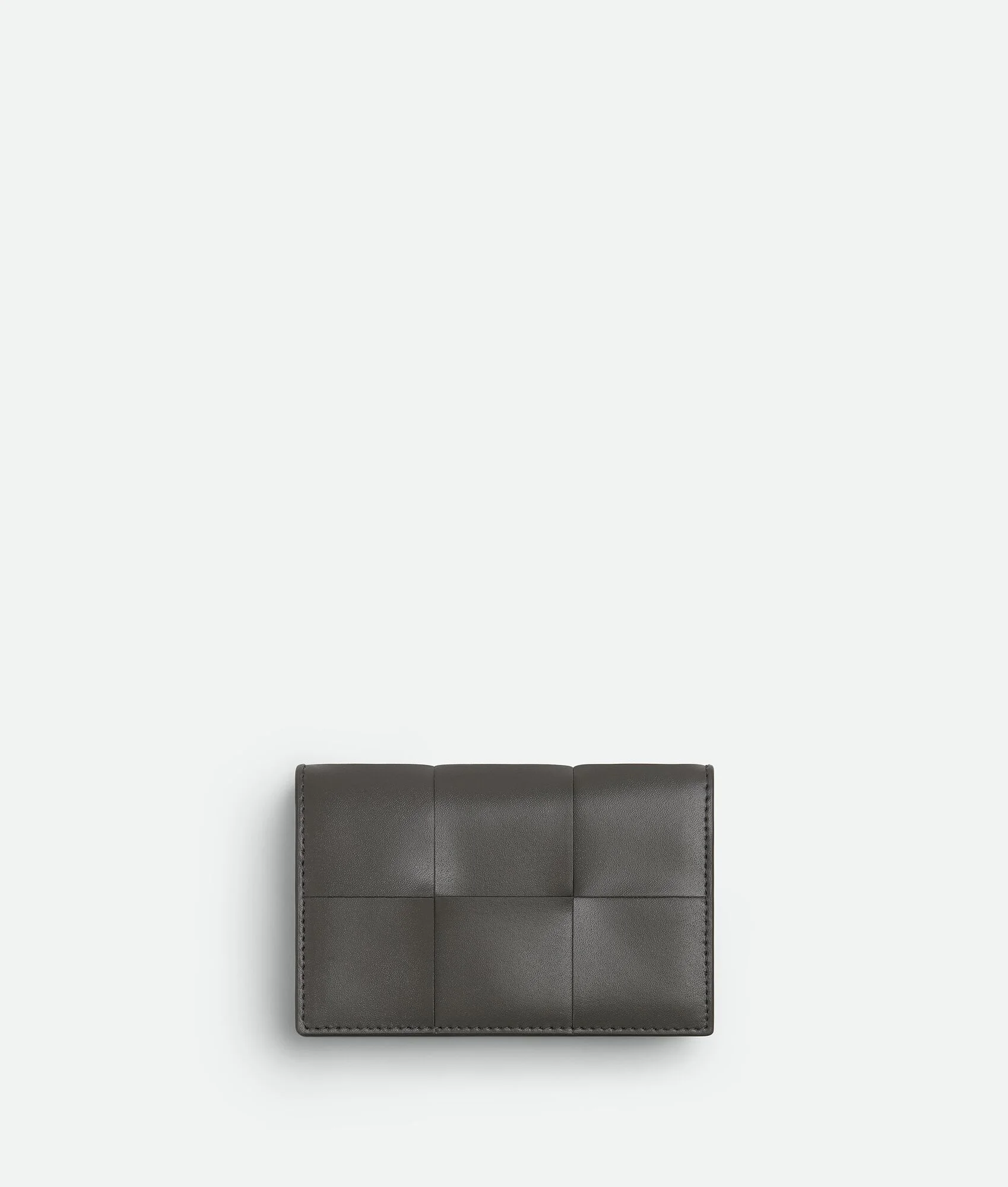 Intreccio calfskin leather card case with contrasted interior. Product Details - One compartment, one card slot - Press stud closure - Material: calfskin - Lining: Calfskin - Color: Lapilli/Limonite - Hardware: Silver finish - Height: 7.5 cm | 2.9” - Width: 12.2 cm | 4.8” - Depth: 2.5 cm | 1” - Made in: Italy - Product code: 814653VBWD61355