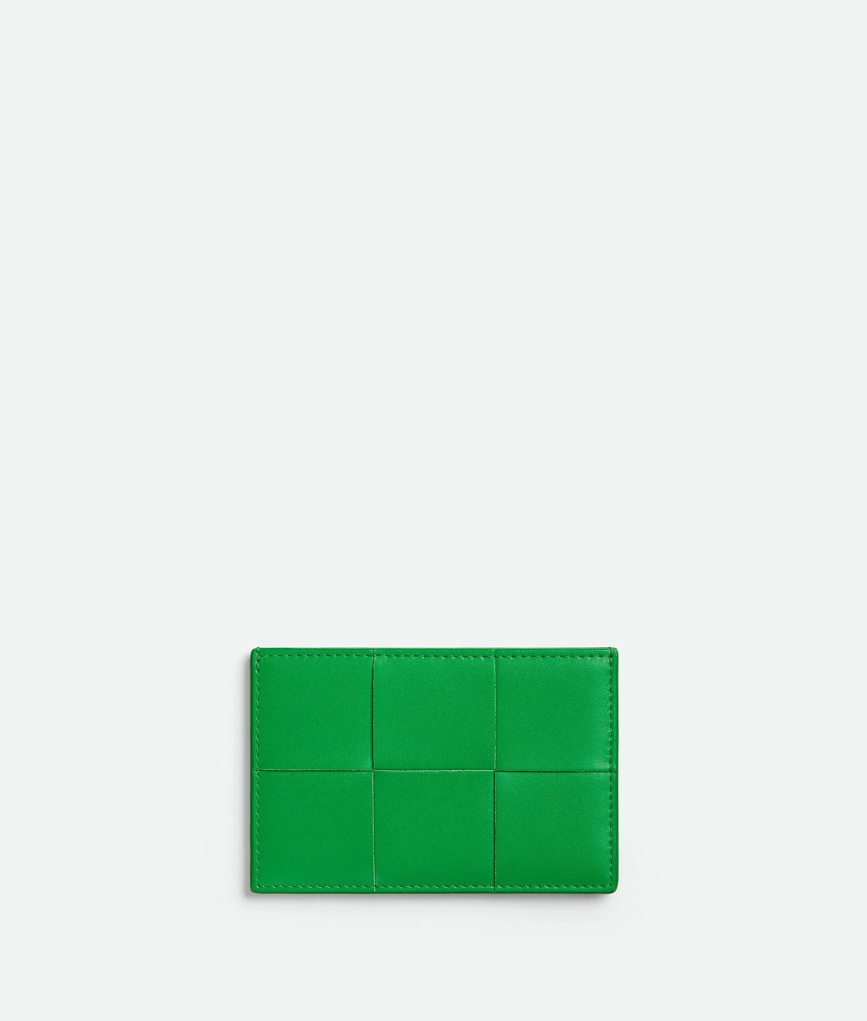 Intreccio leather card case. Product Details - Intreccio leather card case - Three card slots, one central pocket - Material: calfskin - Lining: Calfskin - Color: Parakeet - Height: 7.6 cm | 3" - Width: 11.4 cm | 4.5" - Depth: 0.5 cm | 0.2" - Made in: Italy - Product code: 748052VBWD33724