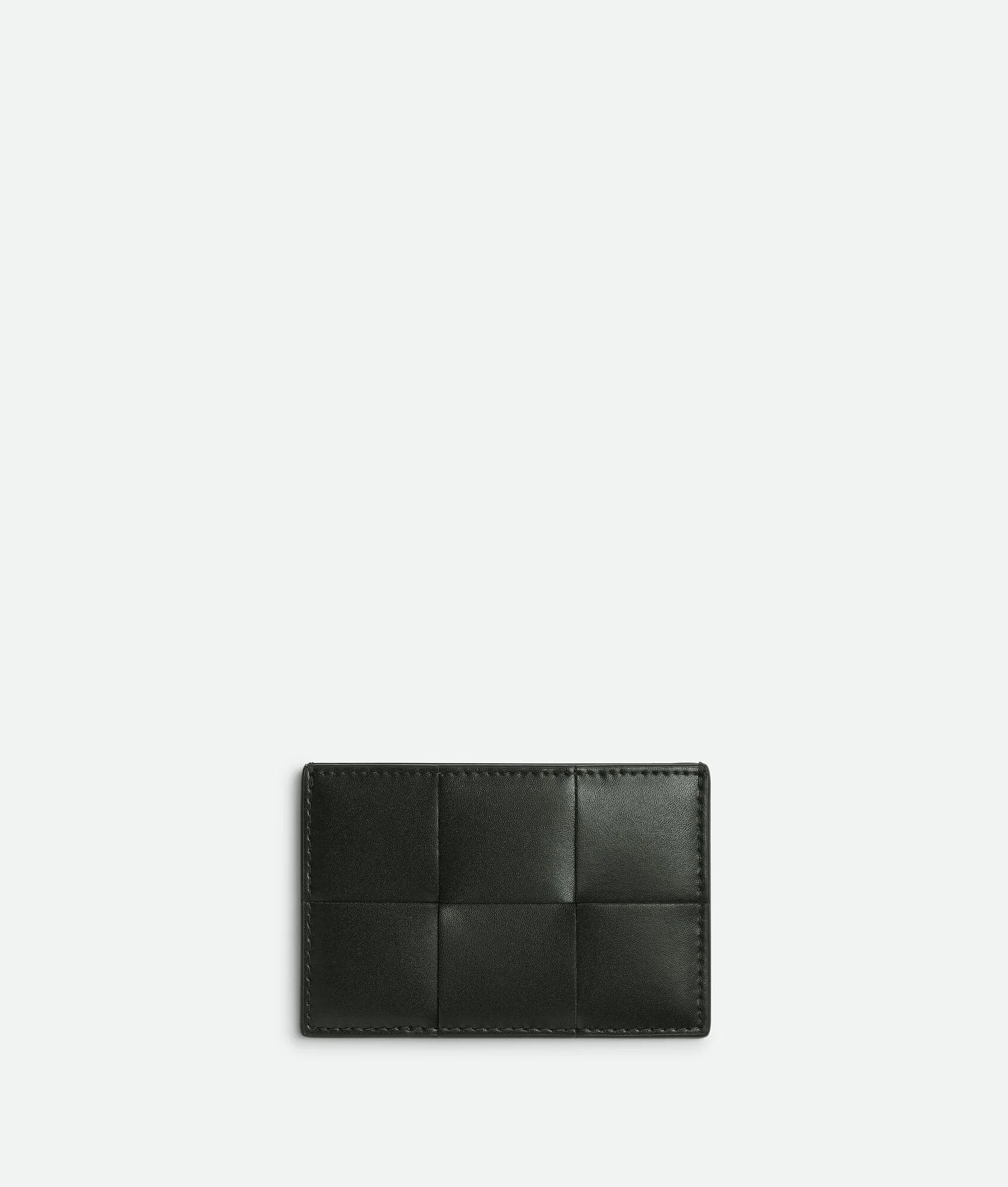 Intreccio calfskin leather card case with contrasted interior. Product Details - Three card slots, one central pocket - Material: calfskin - Lining: Calfskin - Color: Dark Green/Agate Grey - Height: 7.6 cm | 3" - Width: 11.4 cm | 4.5" - Depth: 0.5 cm | 0.2" - Made in: Italy - Product code: 748052VBWD43449