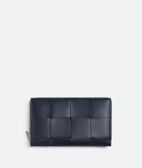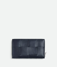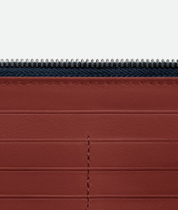 Intreccio calfskin leather wallet with contrasted interior. Product Details - Twelve card slots, two note compartments, two additional pockets, one zipped coin purse - Zip closure - Material: Calfskin - Lining: Calfskin - Colour: Space/Sapele - Hardware: Silver finish - Height: 11.4 cm | 4.5” - Width: 19 cm | 7.5” - Depth: 2 cm | 0.8” - Made in: Italy - Product code: 814649VBWD58888