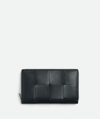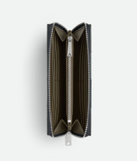 Zip around wallet in Intreccio calf leather with contrasted interior. Product Details - Intreccio calf leather wallet with contrasted interior - Twelve card slots, two note compartments, two additional pockets, one zipped coin purse - Zipper closure - Material: Calfskin - Lining: Calf leather - Color: Ardoise/Cypress - Hardware: Silver finish - Height: 11.4 cm | 4.5" - Width: 19 cm | 7.5" - Depth: 2 cm | 0.8" - Made in: Italy - Product code: 814649VBWD52073