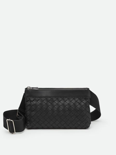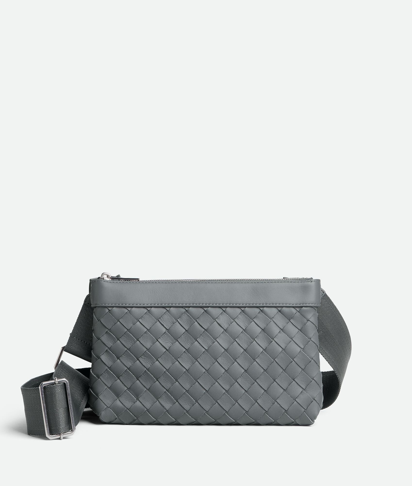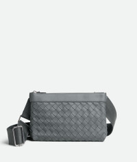 Intrecciato leather crossbody bag. Product details • Intrecciato leather crossbody bag • Two pouches snapped together • Zipper closure Material: 50% Lamb Skin, 50% Calf Skin • Lining: Bonded suede • Color: Thunder • Hardware: Silver finish • Height: 16 cm | 6.3" • Width: 26 cm | 10.2" • Depth: 9 cm | 3.5" • Strap drop: 60 cm | 23.6" Made in: Italy