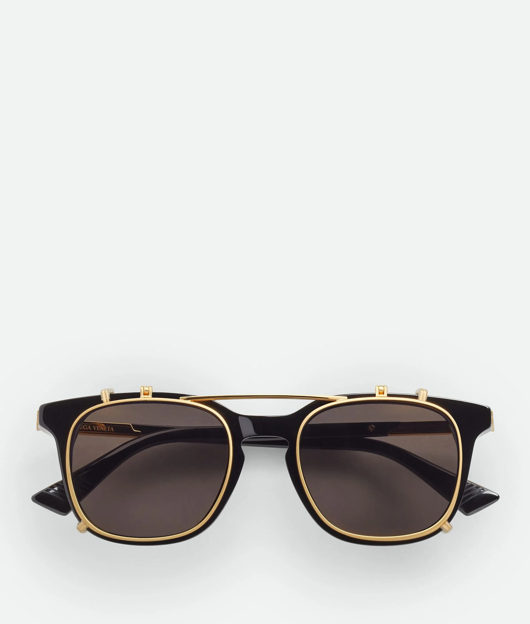 Product Details - Square glasses made with Eastman Acetate Renew, an acetate with 27% recycled content - Clip-on sun lenses with adjustable and removable flip up construction - Gold-finished ribbon detail at the temples - Lenses made from polyamide with 39% bio-based content - Lens width: 49 mm | 1.9"; Bridge length: 20 mm | 0.8"; Temple length: 145 mm | 5.7" - BV1429S 001 - Color: Black/Transparent - Made in: Italy - Product code: 841201V2Q301423 Material - Material: Recycled acetate