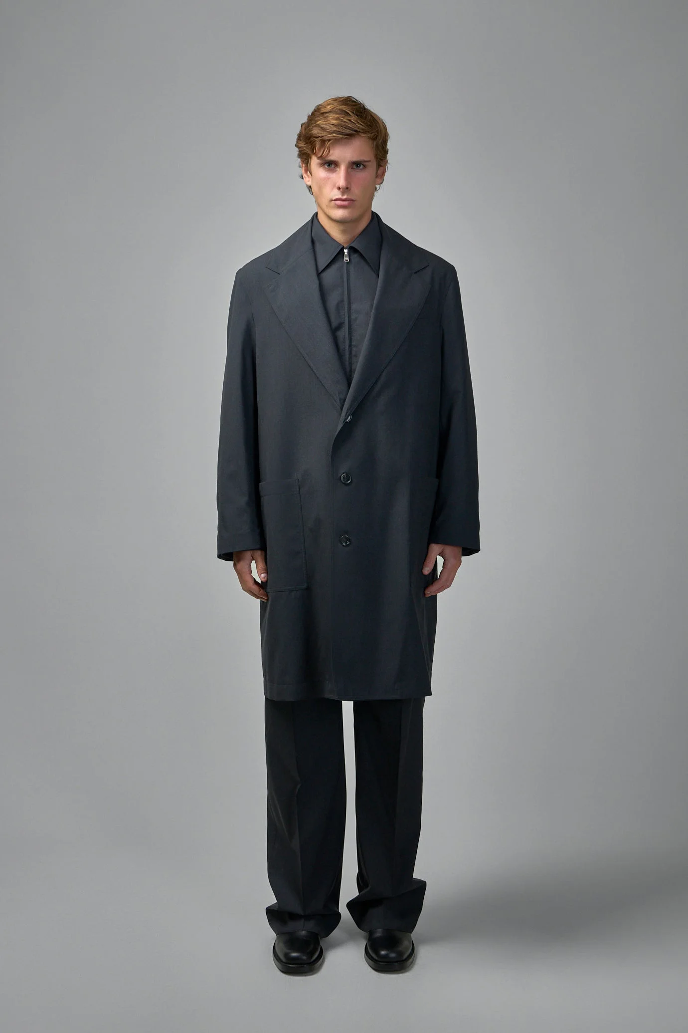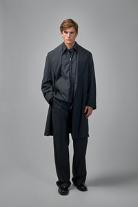 Coat in dark charcoal grey with a mid-length, single-breasted silhouette. It has wide notch lapels, a three-button front closure and large patch pockets. Tailored details include buttoned sleeve cuffs and a visible center-back seam. Materials: 100% Wool Color: charcoal melange SKU: 150984 Brand style: 833834V4XP01307 Size and Fit The model is 1.86m (6.1ft) and wears a size 48. The item has a looser cut but is not necessarily oversized. It’s intended for a comfortable and easy wear.