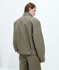 Harrington jacket in lightweight compact cotton with Intrecciato leather collar. Product Details - Light compact cotton Harrington jacket - Intrecciato leather collar - Zipper closure - Fully lined - Relaxed fit - Color: Steel - Made in: Italy - Product code: 852530V6D103976 Material - Material: 100% cotton Size & Fit - Model is 185 cm | 6'1" and is wearing a Bottega Veneta size 46