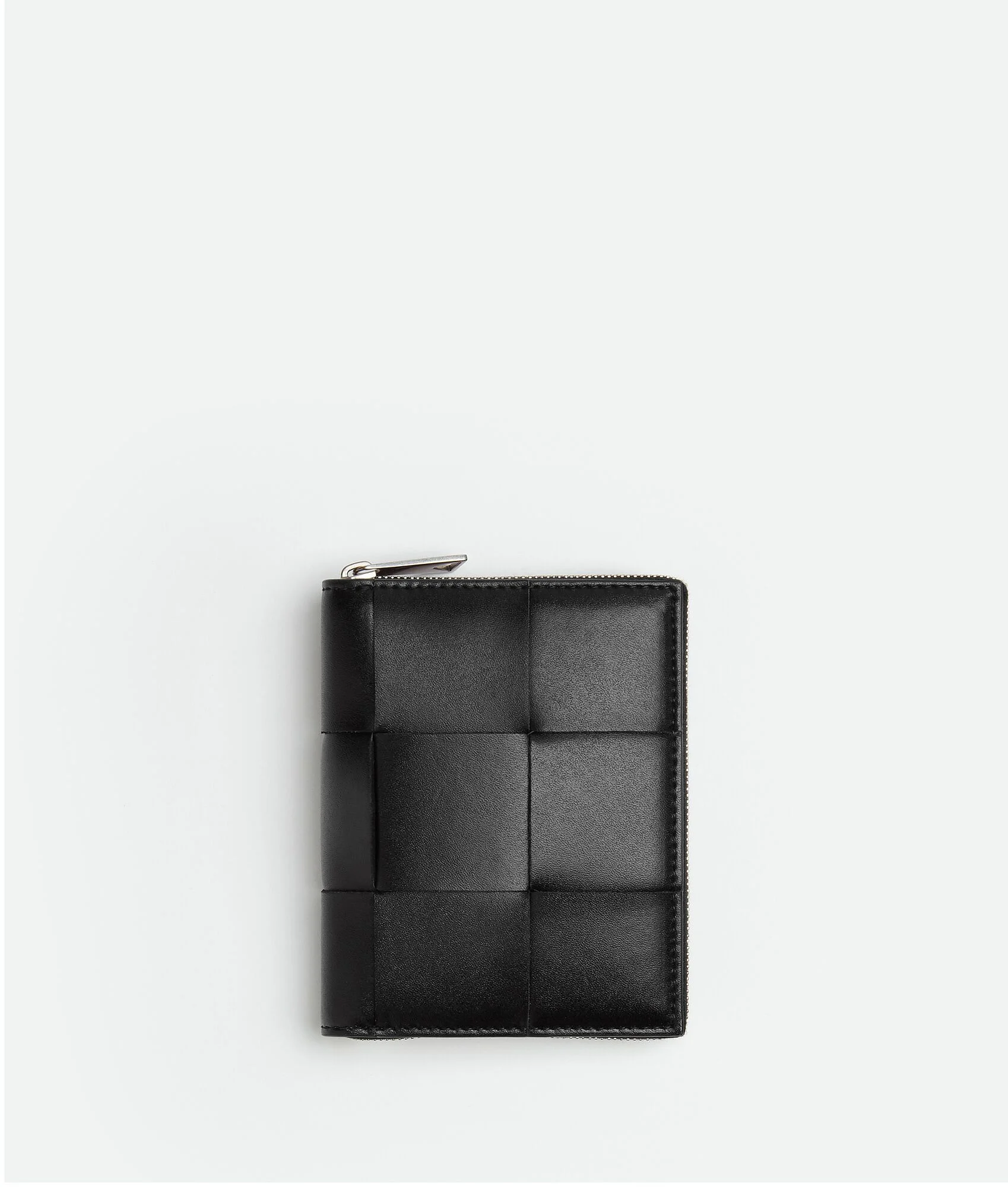 Intreccio leather wallet. Make it unique with a handmade customization by our Product Details - Intreccio leather wallet - Three card slots, one note compartment, three additional pockets, one folded coin purse - Material: calfskin - Lining: Calf leather - Color: Black - Hardware: Silver finish - Height: 12 cm I 4.7" - Width: 9.5 cm I 3.7" - Depth: 2 cm | 0.7" - Made in: Italy - Product code: 708614VBWD28803