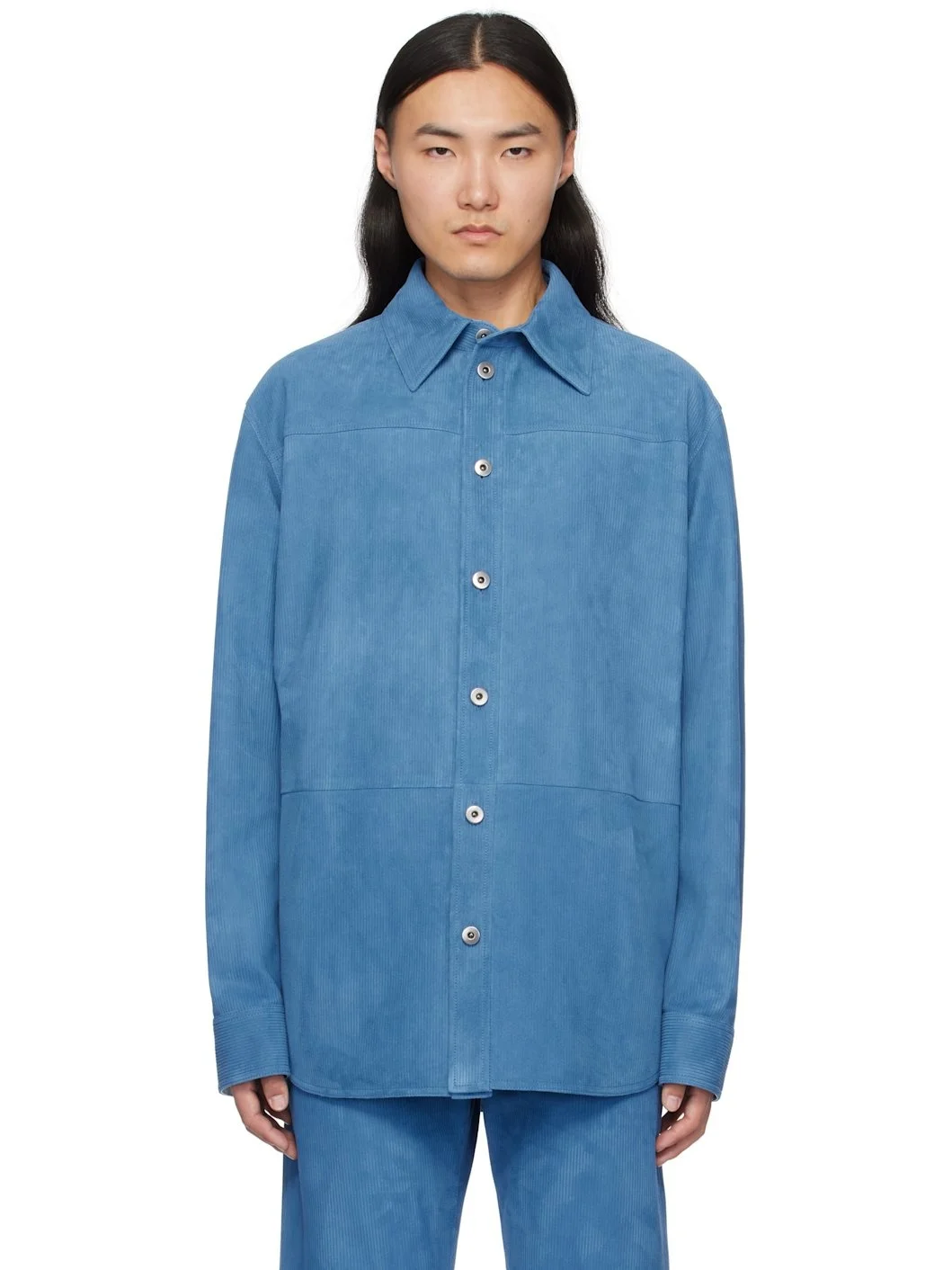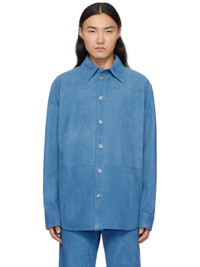 Lambskin suede shirt. Subtle striped pattern embossed throughout. · Spread collar · Button closure · Shirttail hem · Single-button barrel cuffs · Unlined · Silver-tone hardware Supplier color: Aegean blue 100% lambskin. Made in Italy 251798M181002