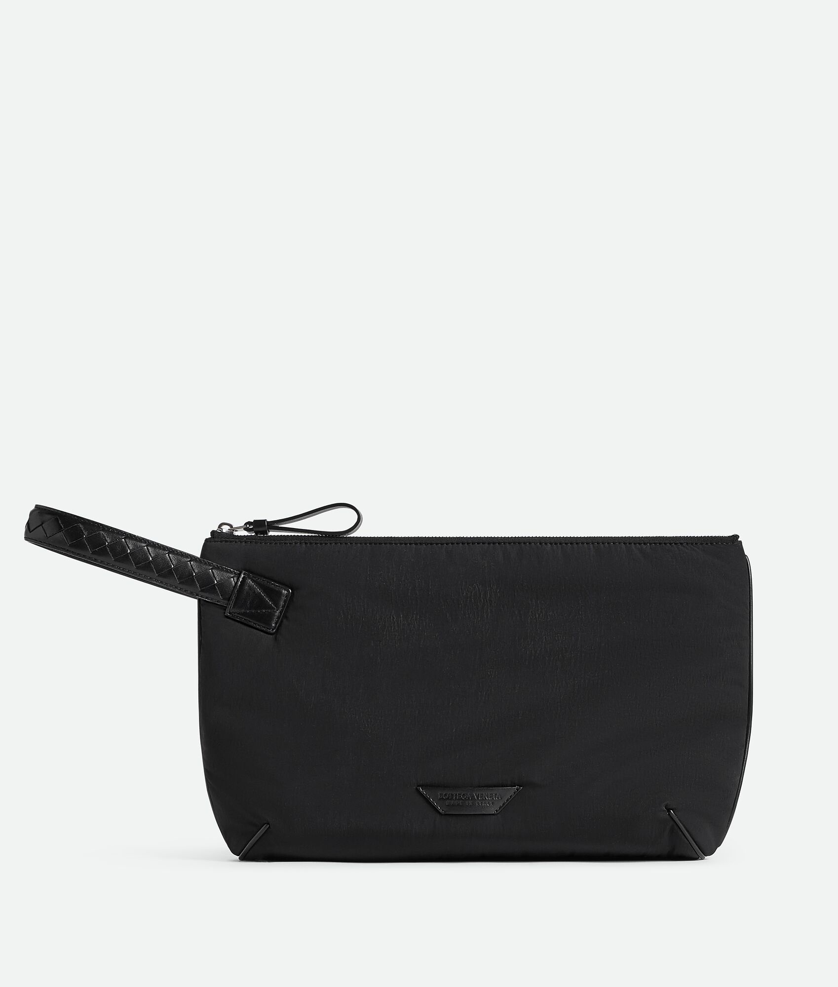 Pouch in lightweight padded nylon with Intrecciato leather wristlet. Product Details - Lightweight padded nylon pouch with Intrecciato detail on wristlet - Single interior zipped pocket and metal key hook on strap - Bottega Veneta leather tab - Zip closure - Material: Polyamide - Lining: Light Paper Nylon - Color: Black - Hardware: Silver finish - Height: 22 cm | 8.7" - Width: 35 cm | 13.8" - Depth: 9 cm | 2.6" - Handle drop: 12 cm | 4.7" - Made in: Italy - Product code: 795234VCQGF8803