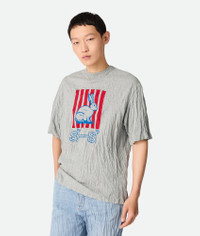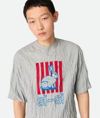 T-shirt in a technical cotton jersey blend with crushed effect and graphic rabbit Product Details - Blended technical cotton jersey T-shirt - SI-SI print - Crushed effect - Regular fit - Material: 52% Cotton, 48% polyester - Color: Light Gray Melange - Made in: Italy - Product code: 833132V5K501367 Size & Fit - Model is 188 cm | 6'2" and is wearing a Bottega Veneta size S