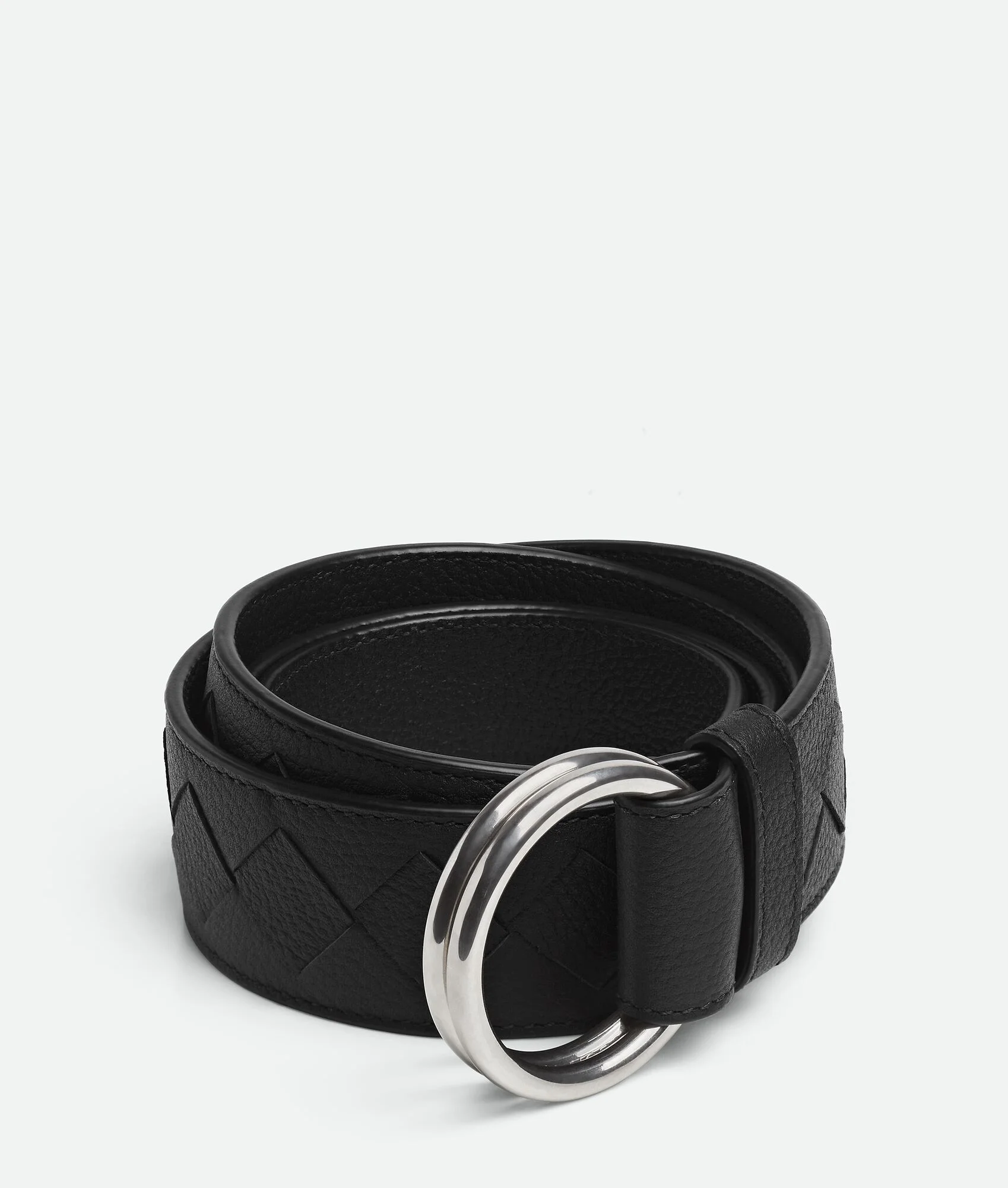Belt in grained leather with Intreccio detailing and double ring buckle. Product Details - Grained leather belt with Intreccio detail - Double ring closure - Lining: Calf leather - Color: Black - Hardware: Silver finish - Made in: Italy - Product code: 843906V5ZL08803 Material - Material: Calfskin Size & Fit - Height: 3.5 cm | 1.4" - Depth: 0.5 cm | 0.2"