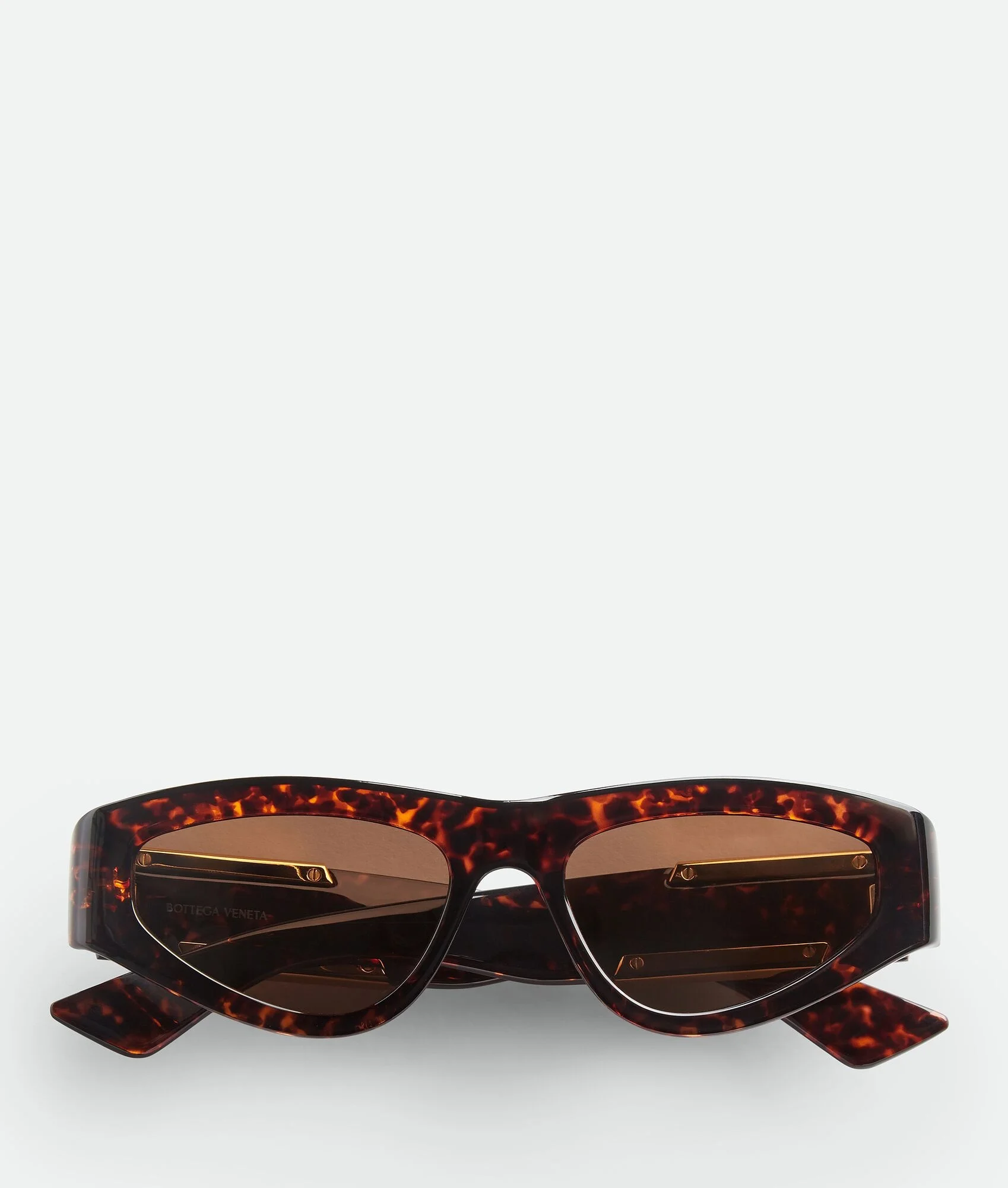 Cat eye sunglasses in polyamide with gold-finished split ribbon detailing. Product Details - Reinterpretation of the classic Bottega Veneta ribbon detail, split at the top and bottom of the temple - Lenses made from polyamide with 39% bio-based content - Frame made from polyamide with 60% bio-based content - Lens width: 53 mm | 2.1"; Bridge length: 17 mm | 0.7"; Temple length: 145 mm | 5.7" - BV1407S 002 - Color: Havana/Brown - Made in: Japan - Product code: 841169VBL801508 Material - Material: Polyamide