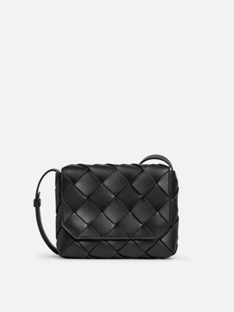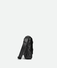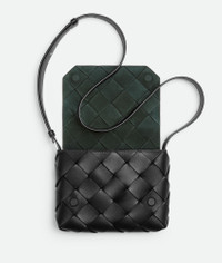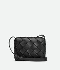 Cross-body bag in smooth Intreccio leather. Product Details - Intreccio smooth leather cross-body bag with adjustable strap - Single interior zipped pocket - Magnetic closure - Material: calfskin - Lining: Suede bonded Intreccio - Color: Black - Hardware: Silver finish - Height: 16.5 cm | 6.5” - Width: 22.5 cm | 8.9” - Depth: 5.5 cm | 2.2” - Strap drop: 57.5 cm | 22.6” - Made in: Italy - Product code: 795637V56A18803