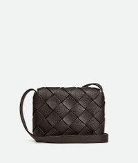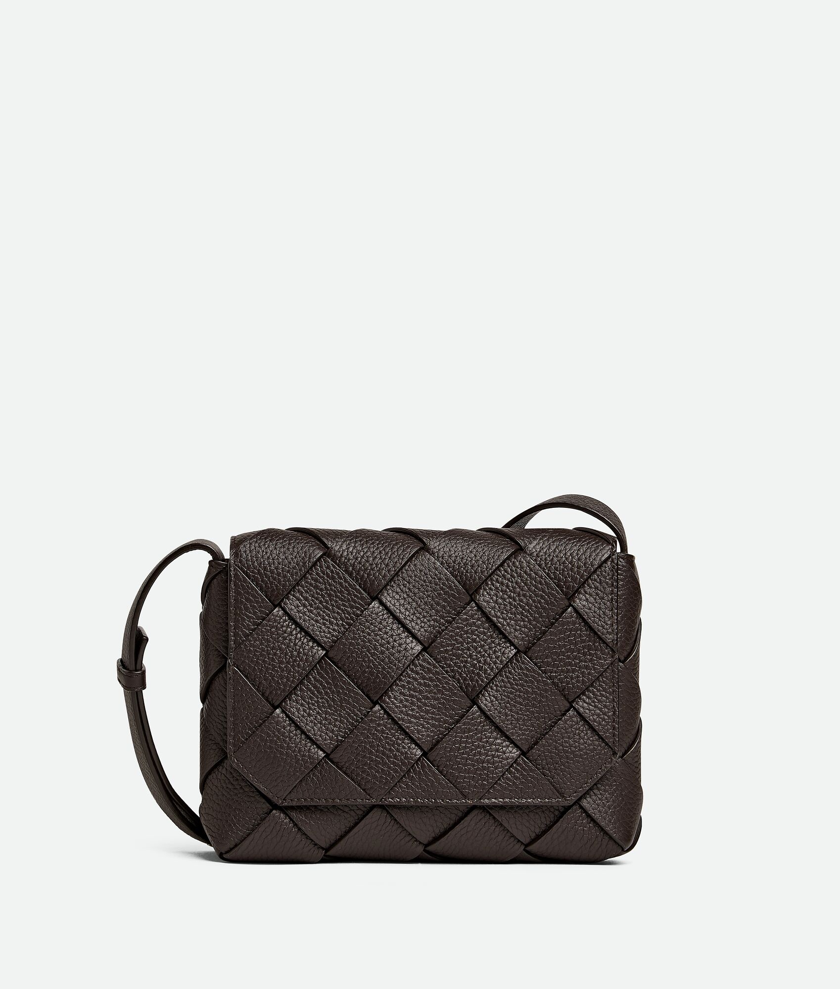 Cross-body bag in grained Intreccio leather with contrasted colour interior. Product Details - Grained Intreccio leather cross-body bag with adjustable strap - Contrasted colour interior - Single interior zipped pocket - Magnetic closure - Material: calfskin - Lining: Calfskin bonded Intreccio - Color: Fondant/Limonite - Hardware: Silver finish - Height: 16.5 cm | 6.5” - Width: 22.5 cm | 8.9” - Depth: 5.5 cm | 2.2” - Strap drop: 57.5 cm | 22.6” - Made in: Italy - Product code: 795637V53512535