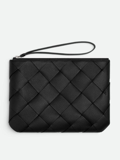 Large wristlet pouch in grained Intreccio leather. Product Details - Single compartment, two interior open pockets - Interior leather tag with embossed logo - Zip closure - Material: calfskin - Lining: Canvas - Color: Black - Hardware: Silver finish - Height: 23 cm | 9.1" - Width: 33 cm | 13" - Depth: 2 cm | 2.6" - Handle drop: 23 cm | 9.1" - Made in: Italy - Product code: 795632V4FV18803