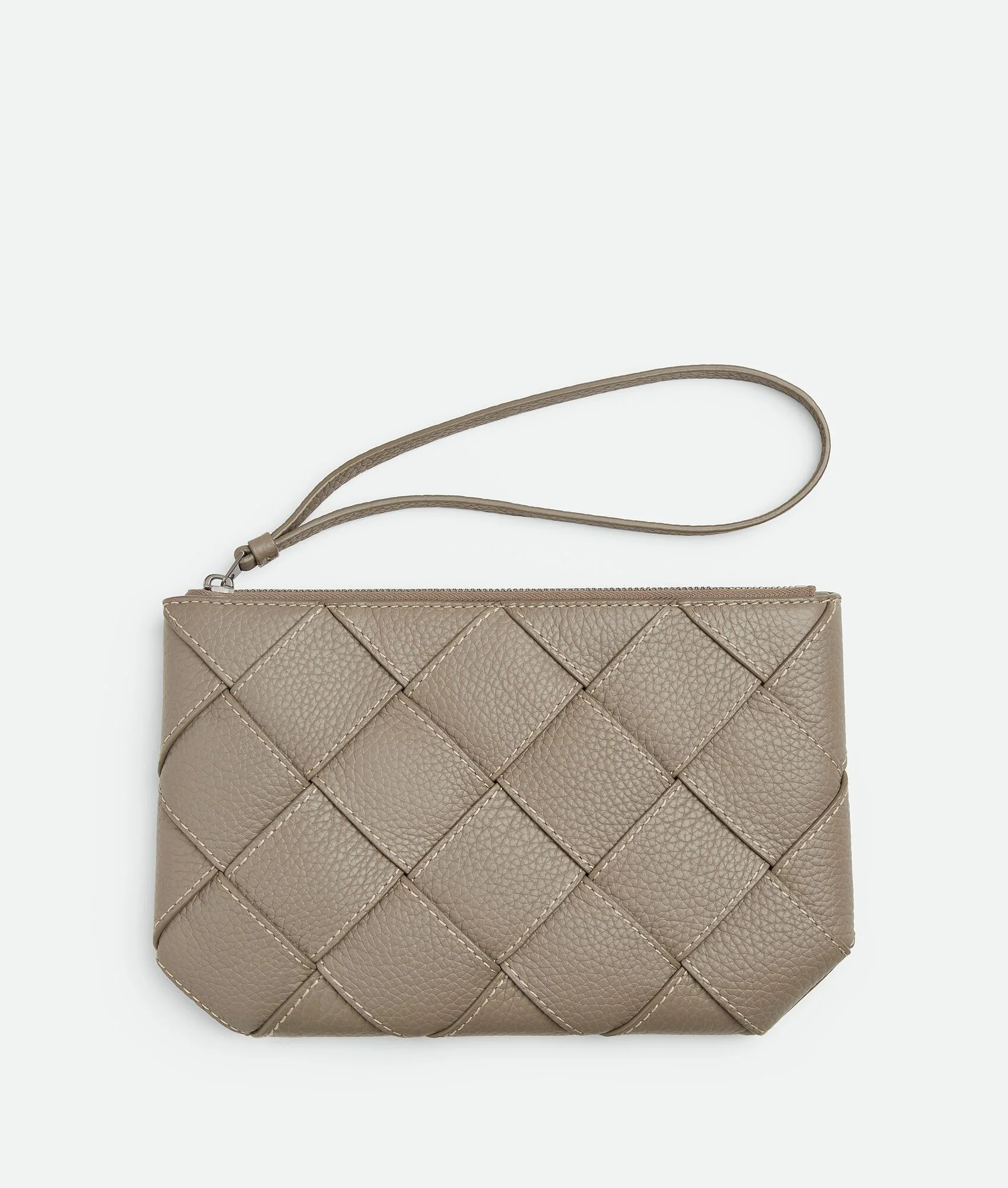 Medium pouch in grained Intreccio leather with contrasted edge stitching. Product Details - Medium wristlet pouch in grained Intreccio leather with contrasted edge stitching - Single compartment - Interior leather tag with embossed logo - Zipper closure - Lining: Canvas - Color: Limestone/Natural - Hardware: Silver finish - Height: 16.5 cm | 6.5" - Width: 25 cm | 9.8" - Depth: 2 cm | 0.8" - Handle drop: 23 cm | 9.1" - Made in: Italy - Product code: 795119V5R902822