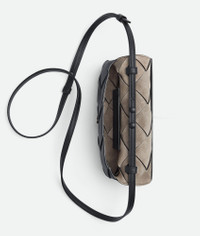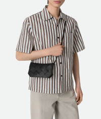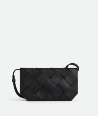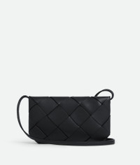 Phone pouch in smooth Intreccio calf leather with detachable strap. Product Details - Intreccio calf leather phone pouch with detachable strap - One main compartment - Internal leather panel with four card slots - Adjustable and detachable strap - Magnet closure - Material: Calfskin - Unlined - Color: Black - Hardware: Silver finish - Height: 10.7 cm | 4.2" - Width: 20.2 cm | 8" - Depth: 2 cm | 0.8" - Made in: Italy - Product code: 837120V5AJ38803