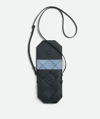 Phone pouch in Intreccio calf leather with contrasted interior. Product Details - Intreccio calf leather phone pouch with contrasted interior - One main compartment - Detachable card holder with three card slots - Magnet closure - Material: Calfskin - Lining: Unlined - Color: Ardoise/Ice - Hardware: Silver finish - Height: 19.5 cm | 7.7" - Width: 13 cm | 5.1" - Depth: 1 cm | 0.4" - Strap Drop: 65 cm | 25.6" - Made in: Italy - Product code: 817827V5AJ32077
