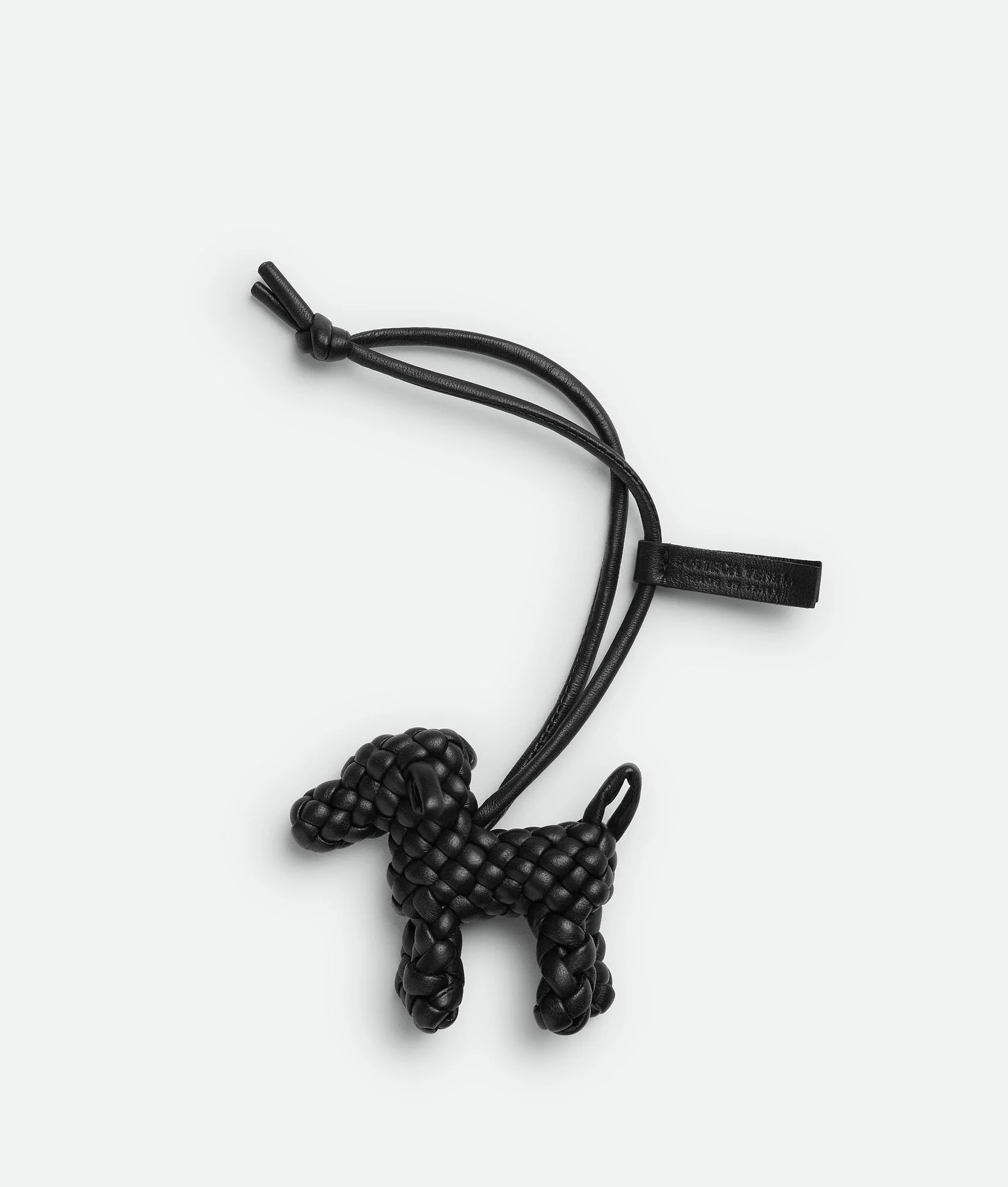 Charm realised in Intreccio nappa leather with John John shape, featuring a leather Product Details - Bottega Veneta leather tag - Leather lanyard designed to be attached to any handle - Material: Lambskin - Unlined - Color: Black - Height: 8.5 cm | 3.3" - Width: 7.5 cm | 3" - Depth: 2 cm | 0.8" - Strap Drop: 17 cm | 6.7” - Made in: Italy - Product code: 807068V3D811000