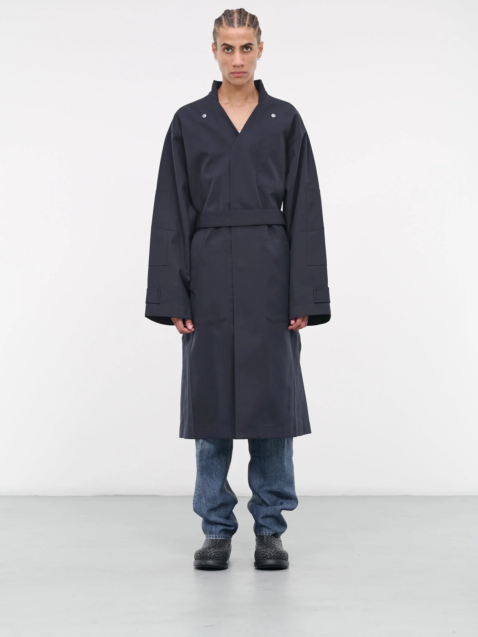 BOTTEGA VENETA black coat, trench design, bonded wool-cotton construction, snap-button collar, v-neckline, wrap-style closure, belted, paneled sleeves, storm flap, mid-length, relaxed fit. Made in Italy 54% Wool 46% Cotton Italian Sizing Model is 6'2" wearing size 48. Shoulders: 19" Chest: 38" Waist: 29"