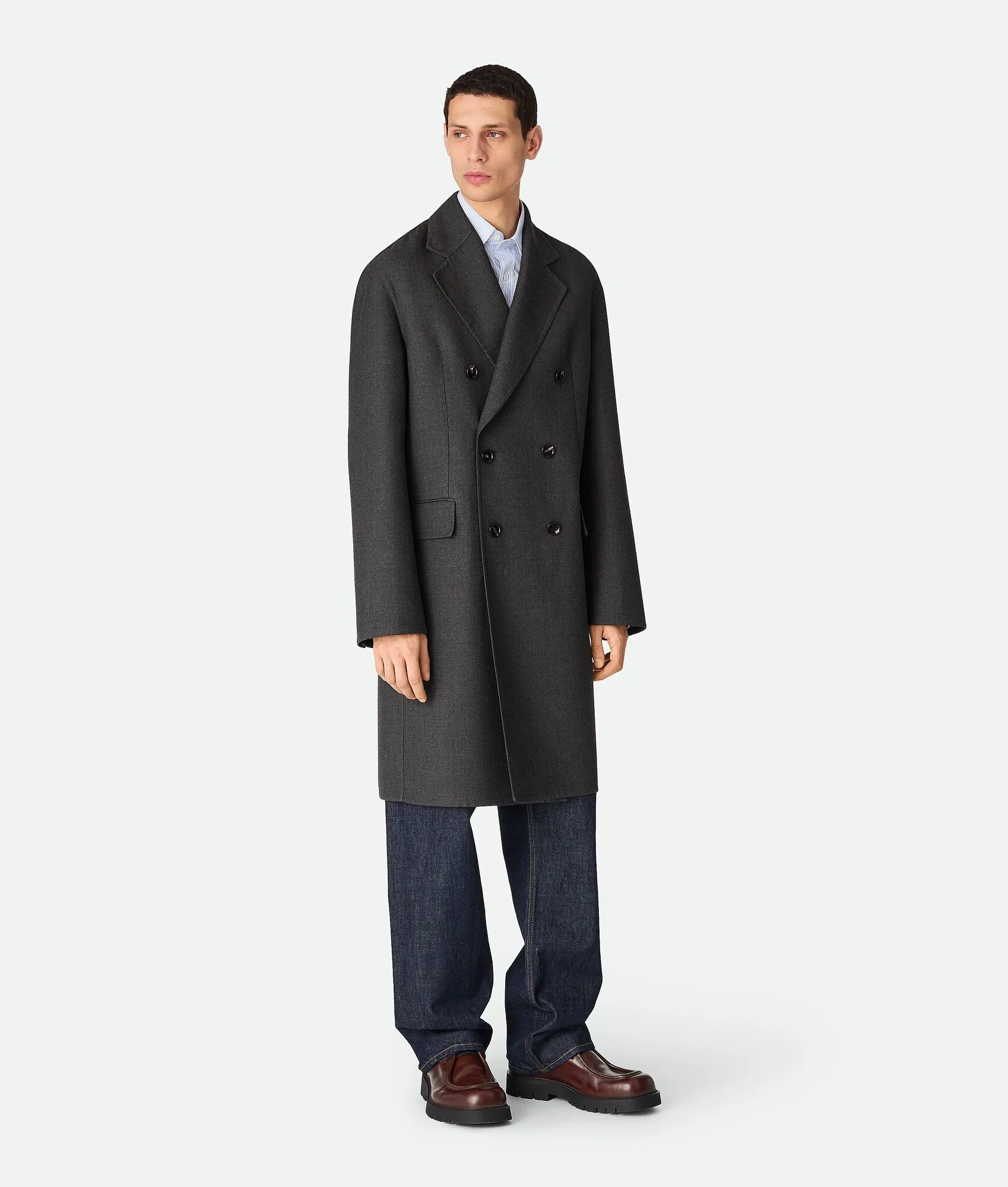 Double breasted coat in compact wool. Product Details - Structured double-breasted wool coat - Button closure - Semi-lined - Regular fit - Color: Anthracite Melange - Made in: Italy - Product code: 833832V34N01003 Size & Fit - Model is 188 cm|6'2" and is wearing a Bottega Veneta size 46