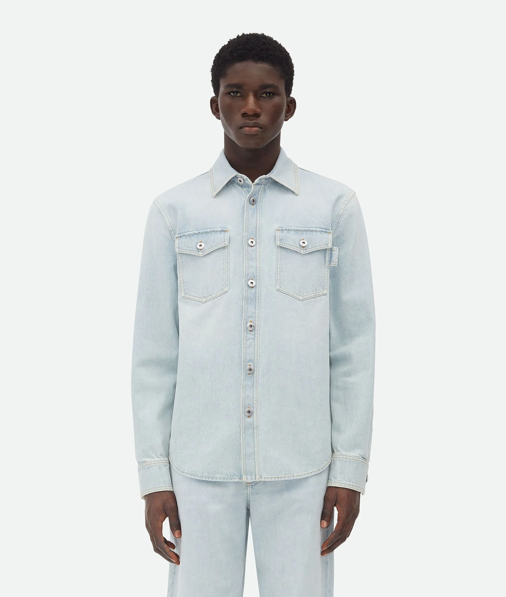 Shirt in extra bleached washed denim. Product Details - Extra bleached wash denim shirt - Special label on the chest pocket - Button closure - Unlined - Regular fit - Material: 100% cotton - Color: Light Blue - Made in: Italy - Product code: 813505V4ZR04132 Size & Fit - Model is 190 cm|6'2" and is wearing a Bottega Veneta size 46