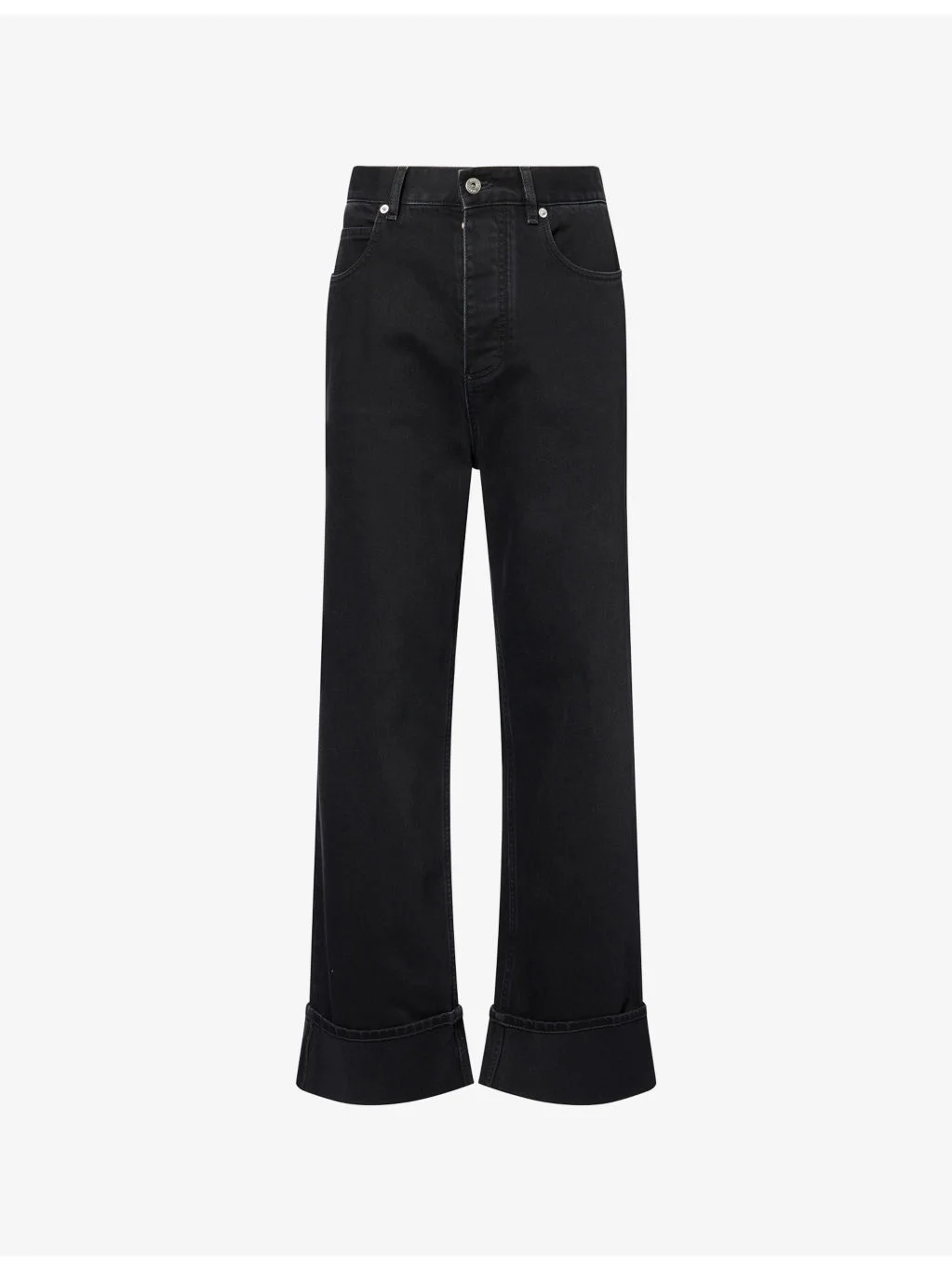 PRODUCT DETAILS - Bottega Veneta denim trousers - 100% cotton - Button and button-fly fastening - Regular fit, mid-rise, straight leg, structured waistband with belt loops, five pockets, brand patch at back, faded wash, turn-up hems - Machine wash cold - Made in Italy - Size UK 32: rise 14in / 36cm, inside leg 30in / 76cm, leg opening 20in / 51cm - Model is 6ft 2in/1.88m and wears a size UK 32 - Midweight, non-stretch Ref: R04607680
