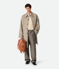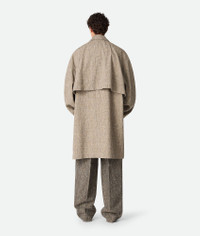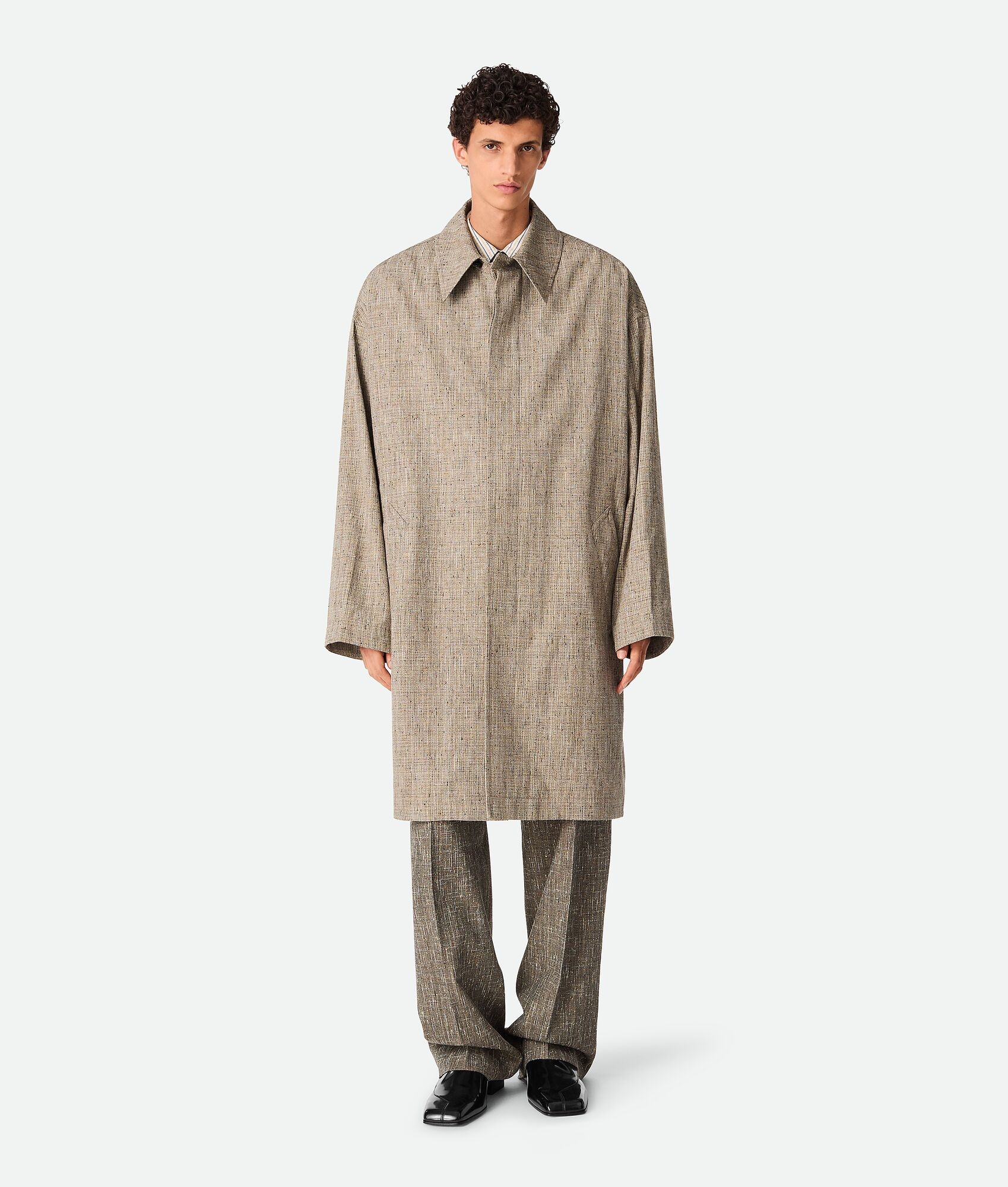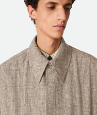 Coat in multicolour fleck viscose. Product Details - Multicolor fleck viscose coat - Hidden button closure - Unlined - Relaxed fit - Material: 40% viscose, 27% cotton, 16% mulberry silk, 8% silk, 7% polyester, 2% linen - Color: Sahara Melange/Multicolor - Made in: Italy - Product code: 820069V5CC02641 Size & Fit - Model is 192 cm|6'3" and is wearing a Bottega Veneta size 46