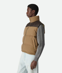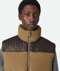 Gilet in organic frosted poplin with Intrecciato leather detail, and a lightweight Product Details - Organic frosted poplin puffer gilet - Intrecciato leather detail - Filled with down and feathers - Special label on the interior - Zipper closure - Contrasted lining - Material: 100% cotton - Color: Liana - Made in: Italy - Product code: 815200V1LE09523