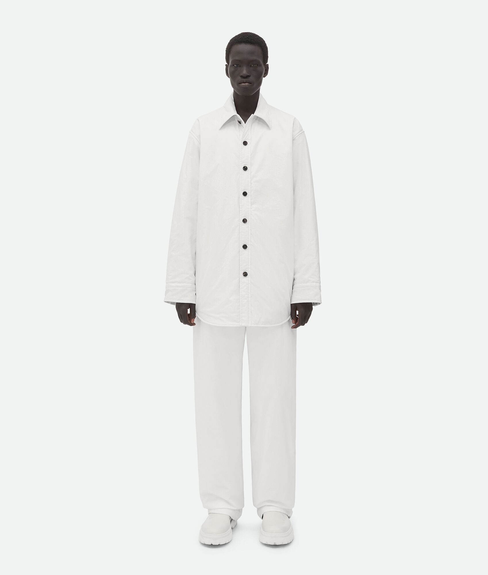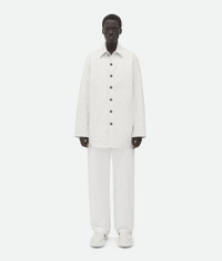 Jacket realised in padded organic frosted poplin with a special label on the placket. Product details • Frosted poplin padded jacket • Special label on the placket • Button closure • Oversized fit Material: 100% Cotton • Color: White Made in: Italy Size & fit • Model is 188 cm | 6'2" and is wearing a Bottega Veneta size S