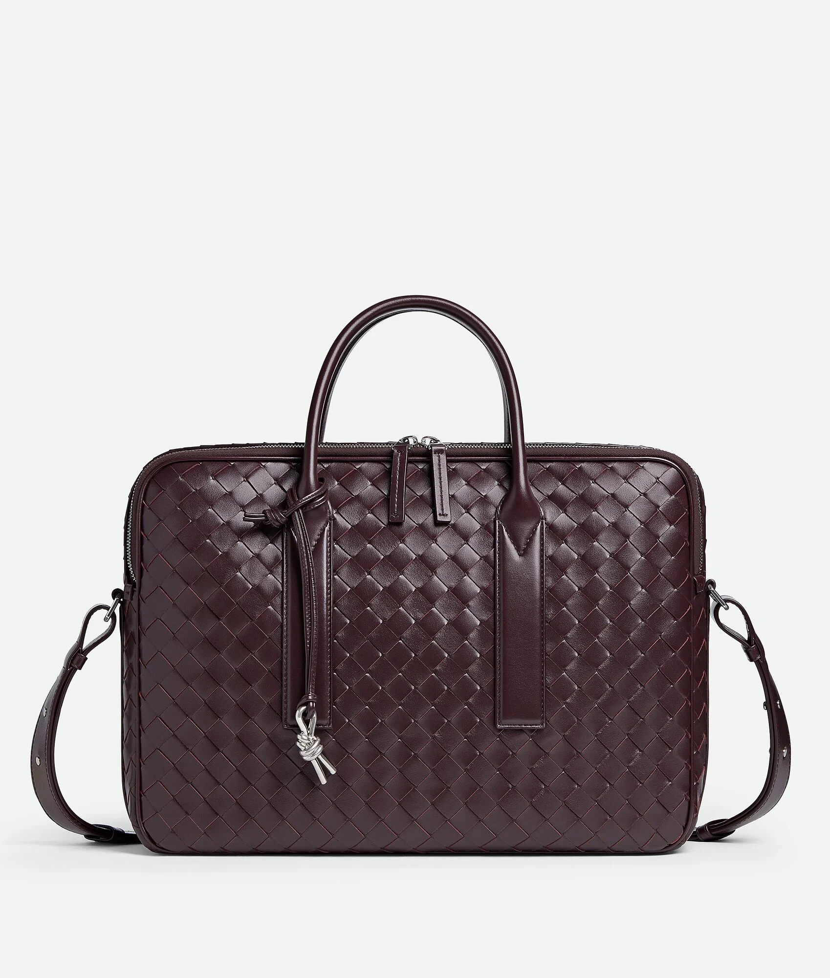 Product Details - Intrecciato leather briefcase with adjustable and detachable strap - Metallic knot detail on the leather strap - Exterior flat pocket and back belt to attach to a trolley - Two zipped compartments with a padded laptop compartment and one zipped pocket - Zipper closure - Lining: Canvas - Color: Dark Barolo - Hardware: Silver finish - Made in: Italy - Product code: 766361V2HL12263 Material - Material: Calfskin Size & Fit - Height: 28.5 cm | 11.2" - Width: 39 cm | 15.4" - Depth: 8 cm | 3.1" - Handle drop: 12 cm | 4.7" - Strap drop: 38 cm | 15" - Fits a 16" laptop, A4 documents, and a tablet