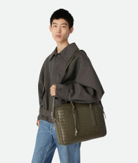 Product Details - Intrecciato briefcase with adjustable and detachable strap - Metallic knot detail on the leather strap - Exterior flat pocket and back belt to attach to a trolley - Two zipped compartments with a padded laptop compartment and one zipped pocket - Zipper closure - Lining: Canvas - Color: Cypress - Hardware: Silver finish - Height: 28.5 cm | 11.2" - Width: 39 cm | 15.4" - Depth: 8 cm | 3.1" - Handle drop: 12 cm | 4.7" - Strap drop: 38 cm | 15" - Made in: Italy - Product code: 766361V2HL13227 Size & Fit - Fits a 16" laptop, A4 documents, and a tablet