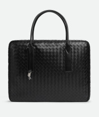 Briefcase in soft Intrecciato leather with long handles and signature knot detail. Product Details - Large Intrecciato weekender with long handles to allow shoulder carry - Single compartment with packing divider for optimal organisation on both sides - Zip closure - Material: Calfskin - Lining: Canvas - Colour: Black - Hardware: Silver finish - Height: 41.5 cm | 16.3" - Width: 50.5 cm | 19.9" - Depth: 15 cm | 5.9" - Handle drop: 23 cm | 9.1" - Made in: Italy - Product code: 765620V2HL18803