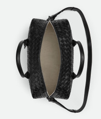 Weekender realised with Intrecciato craftsmanship in soft calfskin leather featuring Product Details - Medium Intrecciato weekender with adjustable and removable strap - Padded laptop compartment and one zipped pocket - Zip closure - Material: Calfskin - Lining: Canvas - Colour: Black - Hardware: Silver finish - Height: 33 cm | 13" - Width: 43 cm | 16.9" - Depth: 19 cm | 7.5" - Handle drop: 16.5 cm | 6.5" - Strap drop: 45 cm | 17.7" - Made in: Italy - Product code: 766372V2HL18803