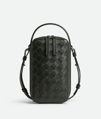 Phone pouch in Intrecciato calf leather with handle and adjustable cross-body strap. Product Details - Intrecciato calfskin leather phone pouch - Handle and adjustable cross-body strap - One main compartment, one flat inside pocket - Zip closure - Lining: Canvas - Color: Dark Green - Hardware: Silver finish - Made in: Italy - Product code: 826829V2HL03009 Material - Material: Calfskin Size & Fit - Height: 19 cm (7.5") - Width: 11 cm (4.3") - Depth: 5 cm (2.0") - Strap drop: 4.5 cm (1.8") - Handle drop: 57 cm (22.4")