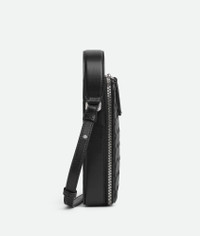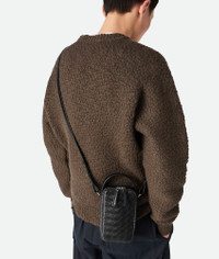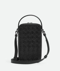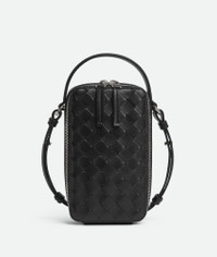Intrecciato calfskin leather phone pouch with handle and cross-body strap. Product Details - Handle and adjustable cross-body strap - One main compartment, one flat inside pocket -Leather gussets preventing items to fall from the sides - Zip closure - Material: Calfskin - Lining: Canvas - Colour: Black - Hardware: Silver finish - Height: 19 cm | 7.5” - Width: 11 cm | 4.3” - Depth: 4 cm | 1.6” - Handle Drop: 6 cm | 2.7” - Strao drop: 55 cm | 21.6” - Made in: Italy - Product code: 826829V2HL08803