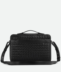 Slim briefcase in soft Intrecciato calfskin leather with adjustable strap and back Product Details - Slim Intrecciato briefcase with adjustable and detachable strap and retractable handle - Back belt to fit on trolley - One interior open laptop compartment, one interior zipped pocket, two interior flat phone pockets - Zip closure - Material: calfskin - Lining: Canvas - Color: Black - Hardware: Silver finish - Height: 26 cm | 10.2" - Width: 38 cm | 15" - Depth: 6.5 cm | 2.6" - Handle drop: 2 cm | 0.8" - Made in: Italy - Product code: 786662V2HL18803