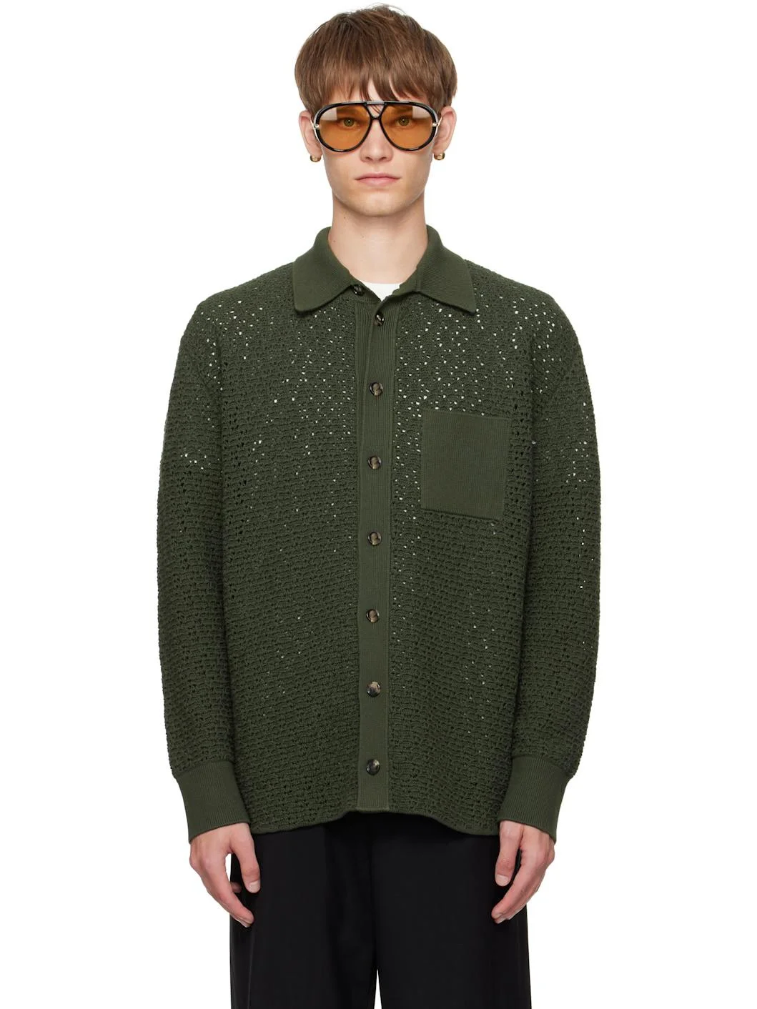 Crochet cotton cardigan. · Rib-knit spread collar, hem, and cuffs · Button closure · Patch pocket at chest · Buttoned cuffs Supplier color: Shrub Body: 100% cotton. Trim: 95% cotton, 4% polyamide, 1% elastane. Made in Italy 252798M192001