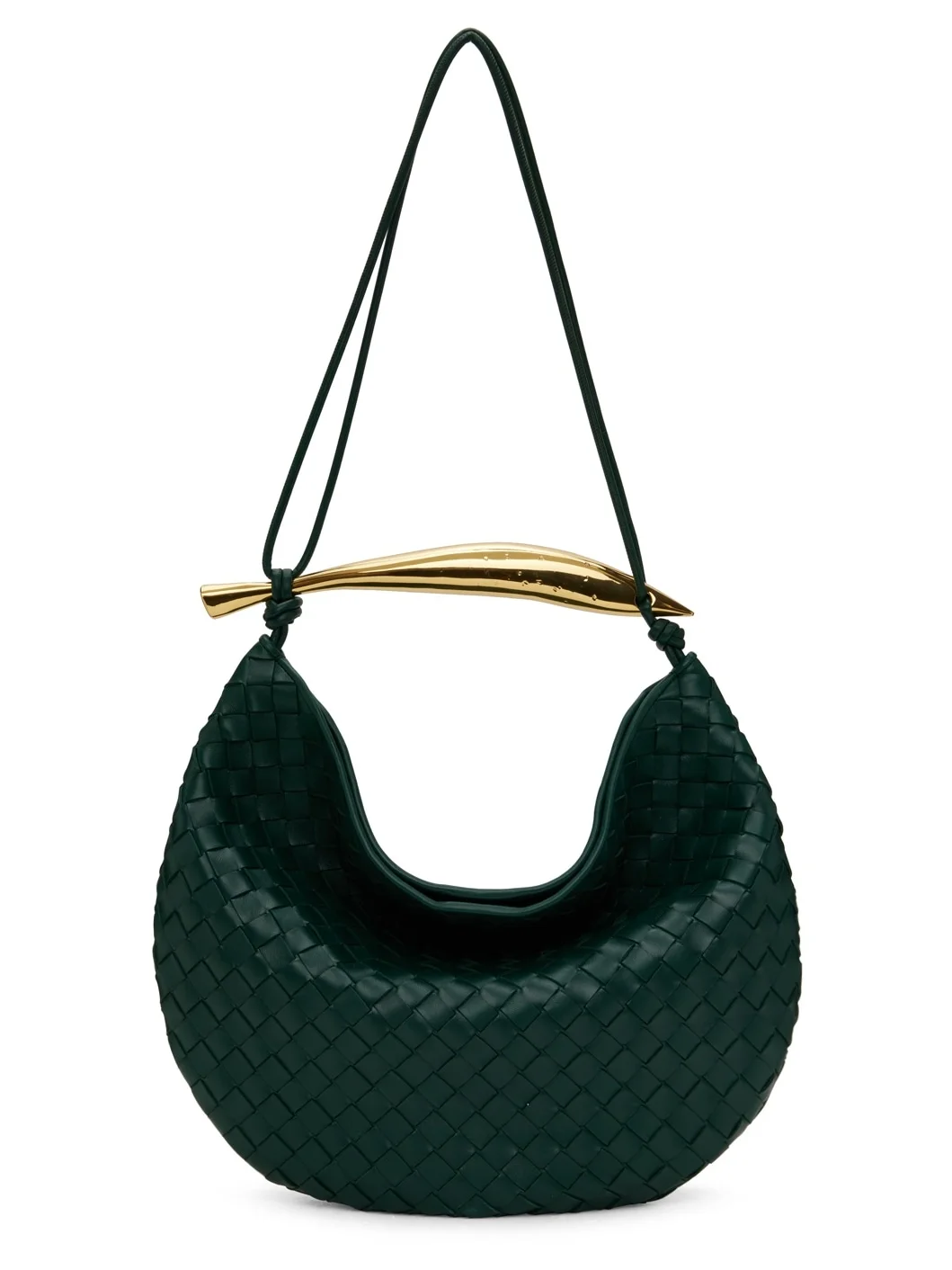 Intrecciato-woven grained lambskin messenger bag in green. · Sculptural metal carry handle · Fixed shoulder straps · Magnetic tab at open throat · Detachable zip pouch at interior · Unlined · H13" x W16" x D1.25" Supplier color: Emerald 100% lambskin. Made in Italy 241798M170010