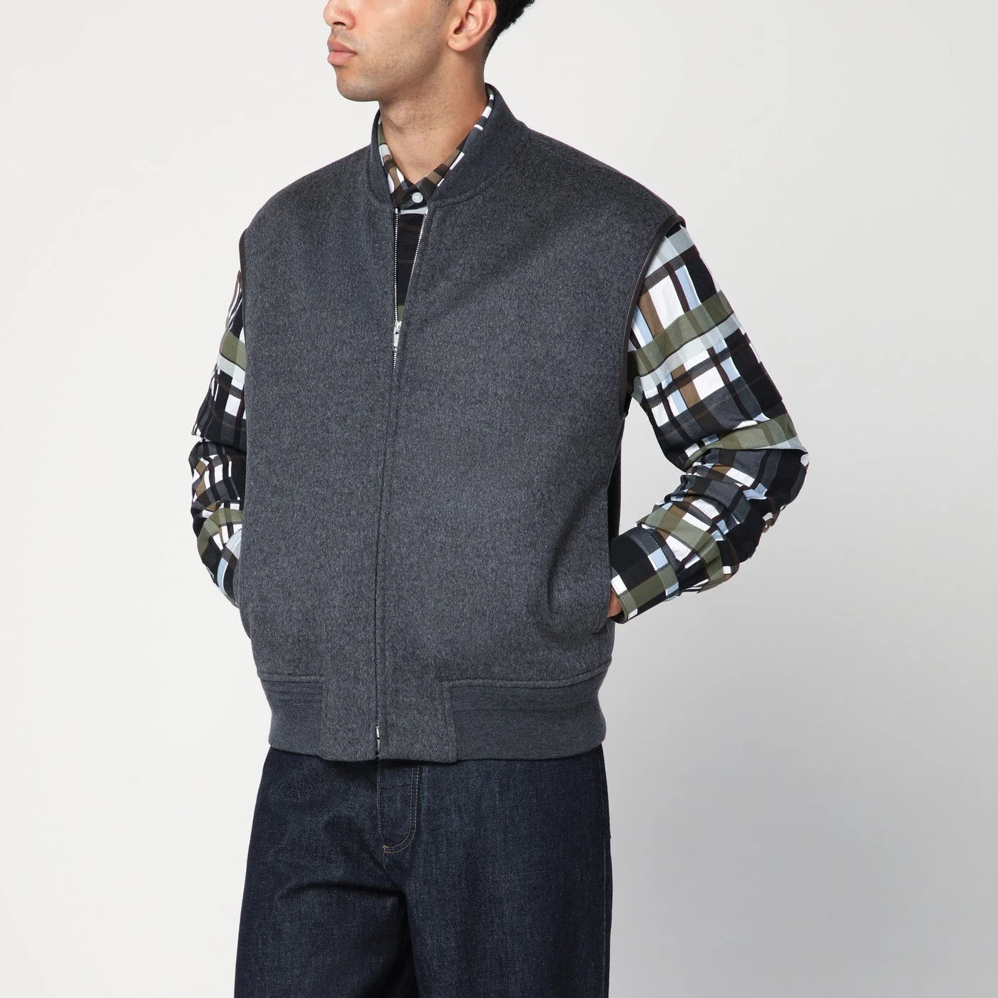 Bottega Veneta gilet in grey wool fabric characterized by a front closure with double zip two side welt pockets leather armholes and ribbed knit edges.