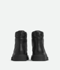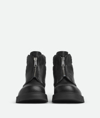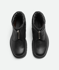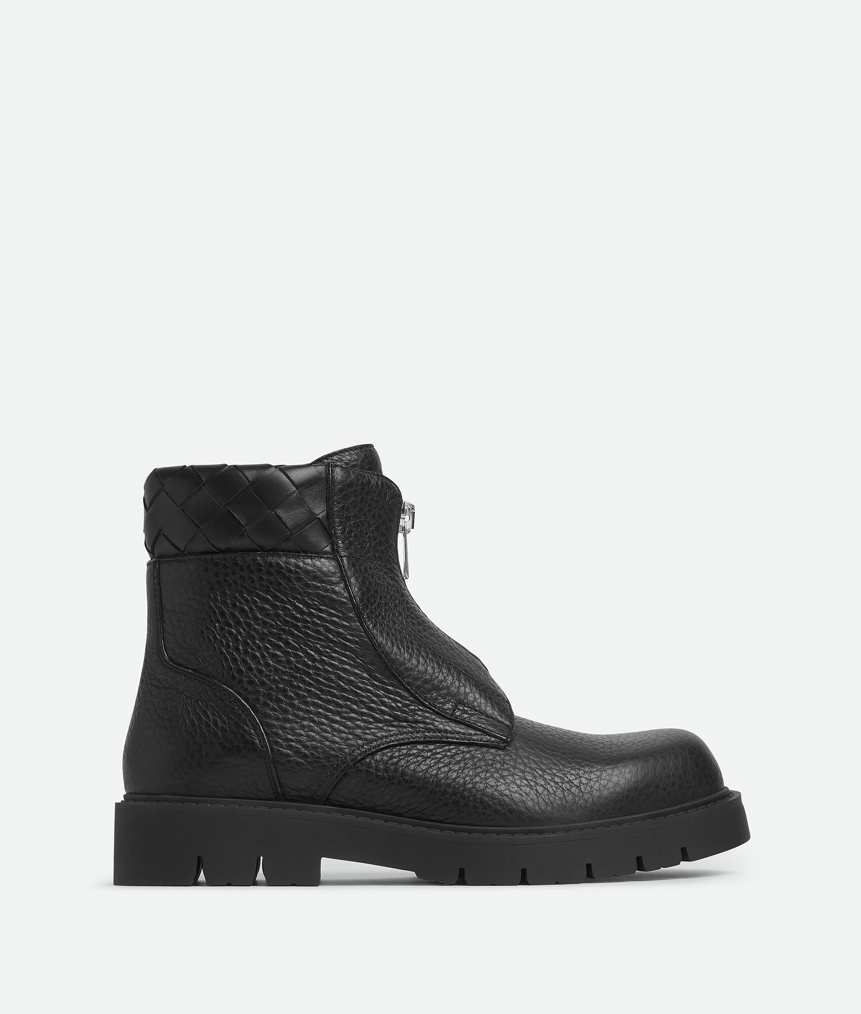 Zip ankle boot in grainy calfskin leather with Intrecciato collar. Product Details - Grainy leather ankle boot - Intrecciato leather collar - Front zip closure - Material: Calfskin - Lining: Calfskin - Color: Black - Rubber outsole - Flatform: 4.5 cm | 1.8" - Made in: Italy - Product code: 796449V4EP01001