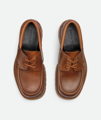 Lace-up boat shoe realised in weathered calfskin leather with leather laces. Product Details - Weathered leather boat shoe - Material: Calfskin - Lining: Calfskin - Color: Light Wood - Rubber outsole - Flatform: 4.5 cm | 1.8" - Made in: Italy - Product code: 741323V4AF02742