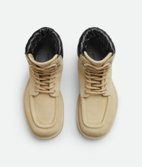 Lace-up ankle boot in rugged suede with Intrecciato leather collar and crepe effect Product Details - Rugged suede lace-up ankle boot - Intrecciato leather collar - Material: calfskin - Lining: Calfskin - Color: Saturn/Black - Crepe-effect rubber outsole - Flatform: 4 cm | 1.6” - Made in: Italy - Product code: 806864V4PR12529
