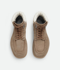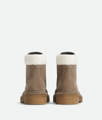 Lace-up ankle boot in rugged suede with Intrecciato leather collar and crepe effect Product Details - Rugged suede lace-up ankle boot - Intrecciato leather collar - Material: Calfskin - Lining: Calfskin - Color: Driftwood/White - Crepe-effect rubber outsole - Flatform: 4 cm | 1.8” - Made in: Italy - Product code: 806864V4PR13144