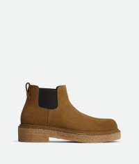 Chelsea ankle boot in rugged suede with crepe effect outsole. Product Details - Rugged suede Chelsea ankle boot - calfskin - Lining: Calfskin - Color: Cork - Crepe-effect rubber outsole - Flatform: 4 cm | 1.6” - Made in: Italy - Product code: 806937V4QN02615