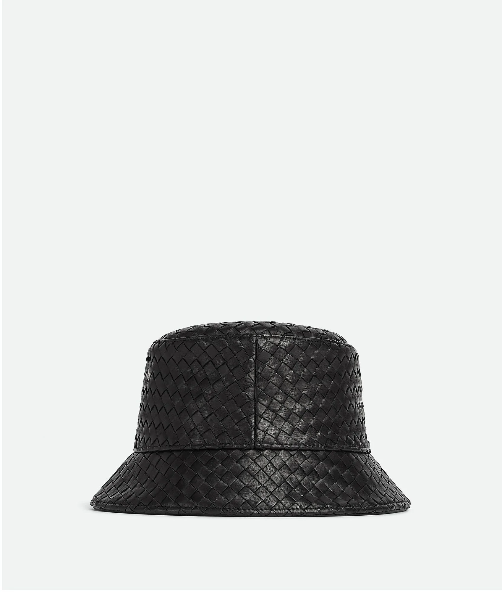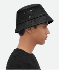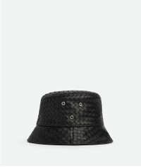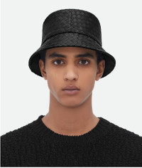 Intrecciato leather bucket hat. Product Details - Intrecciato leather bucket hat - Fully lined - Material: Lambskin - Color: Black - Made in: Italy - Product code: 687343VZQO51000