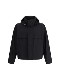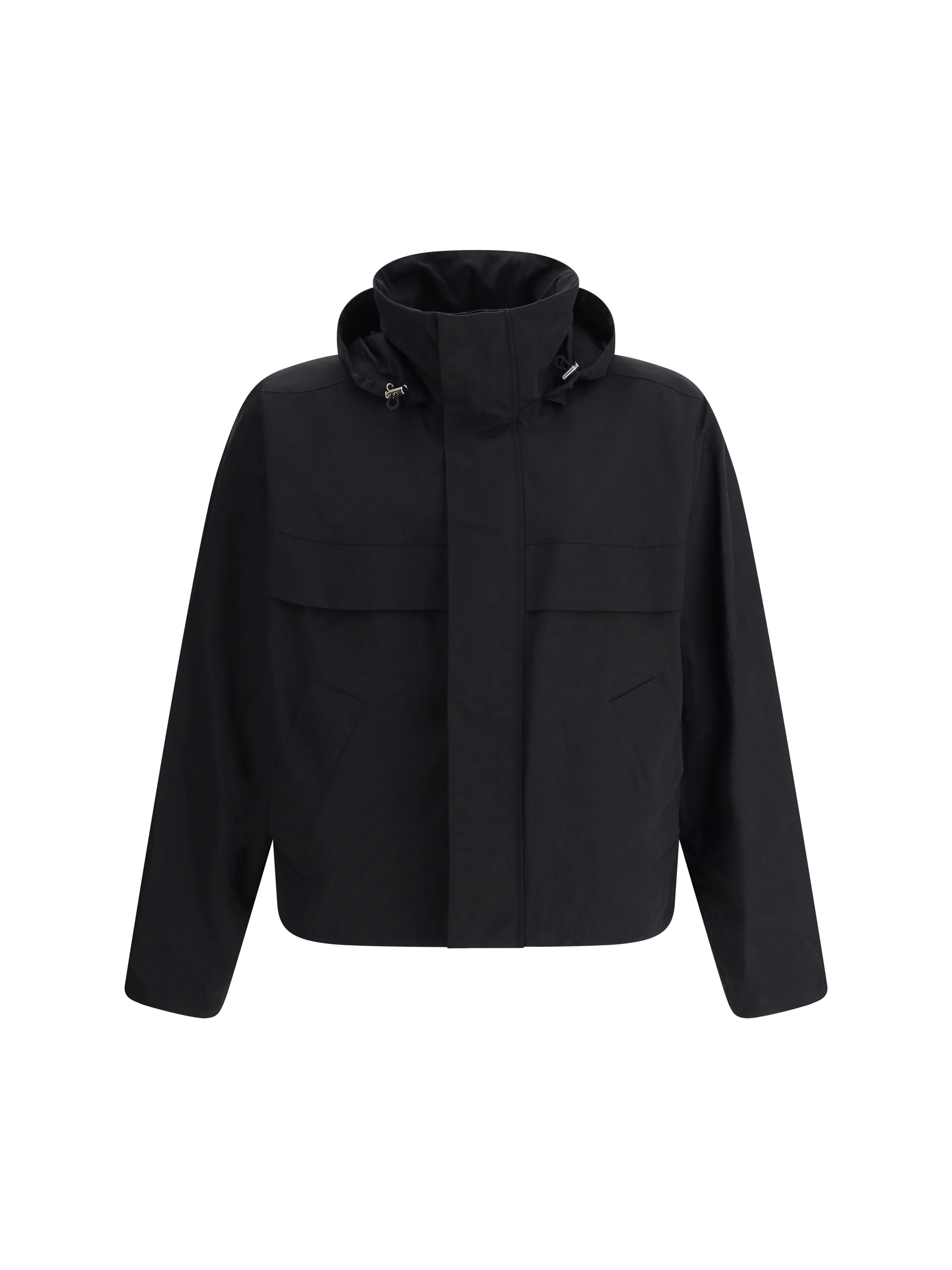 Bottega Veneta's Hooded Jacket is a versatile and functional garment featuring a high collar and drawstring-adjustable hood. The concealed zipper closure ensures a clean look, while the two side welt pockets with flaps and two front patch pockets with flaps provide ample storage space. The drawstring-adjustable hem allows you to customize the fit, combining practicality and sophistication typical of the brand. DETAILS sku 815285V4Y50_1000 composition: POLYAMIDE 61% COTTON 39% color group: BLACK gender: MAN season: SS25 size chart: STANDARD category name: COATS icon: icon