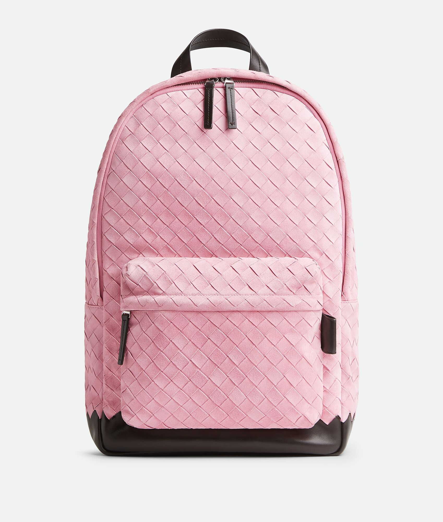 Backpack in Intrecciato suede and leather. Product Details - Intrecciato suede and leather backpack - Single exterior zipped pocket, leather loop detail - Single interior laptop compartment - Zip closure - Lining: Canvas - Color: Rose/Fondant - Hardware: Silver finish - Height: 46cm - Width: 30 cm | 11.8" - Depth: 14 cm | 5.5” - Handle drop: 6cm - Made in: Italy - Product code: 828117V1QEC5838