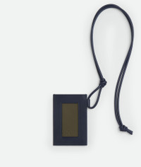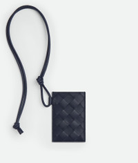 Badge holder in Intrecciato calf leather with contrasted interior. Product Details - Intrecciato calf leather badge holder with contrasted interior - Single card slot - Leather strap - Material: Calfskin - Lining: Calf leather - Color: Abyss/Cypress - Height: 10.5 cm | 4.1" - Width: 7 cm | 2.8" - Depth: 0.5 cm | 0.2" - Strap Drop: 45 cm | 17.7" - Made in: Italy - Product code: 785985VCPQ53262